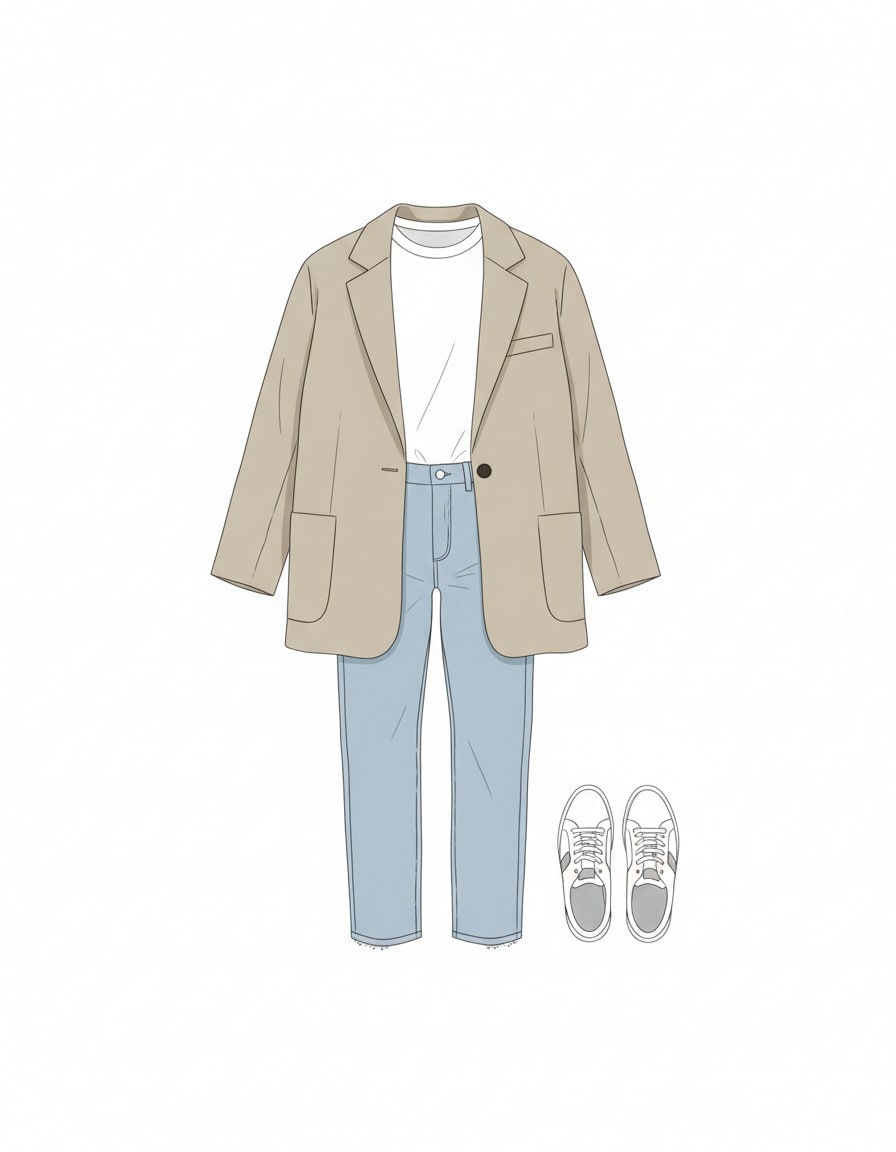 - Blazer + white tee + jeans — casual Friday, coffee, low-key dinner.