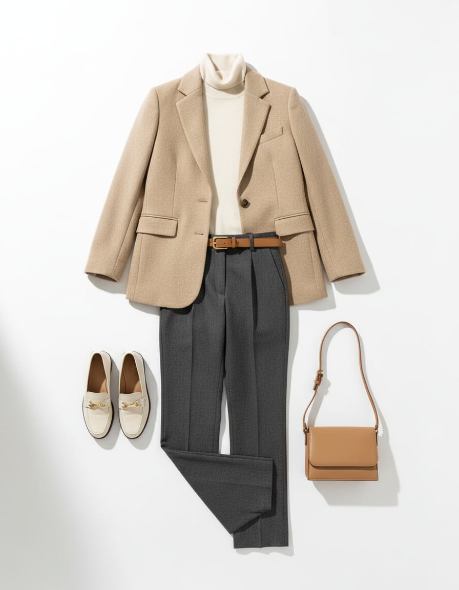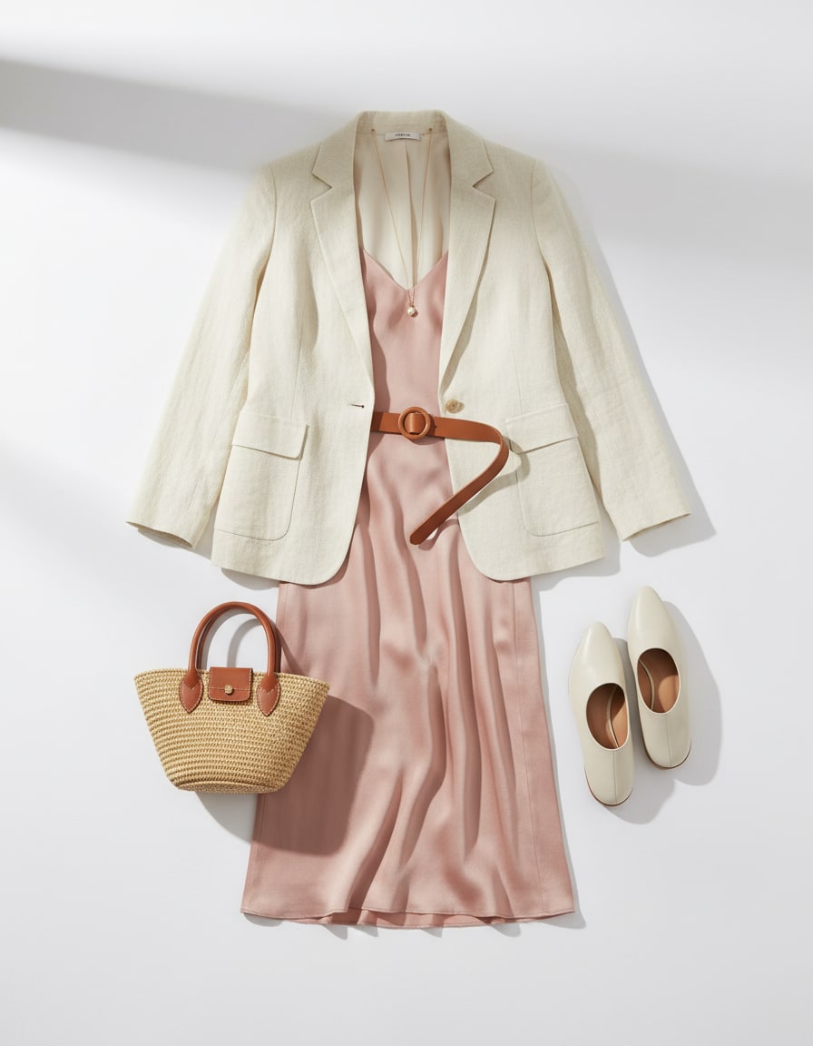 Classic and fast. A neutral blazer (navy, black, or beige) over a white tee and straight or slim jeans works for casual Friday, coffee runs, or low-key dinners. Roll the blazer sleeves once for a relaxed look. Finish with sneakers or loafers.