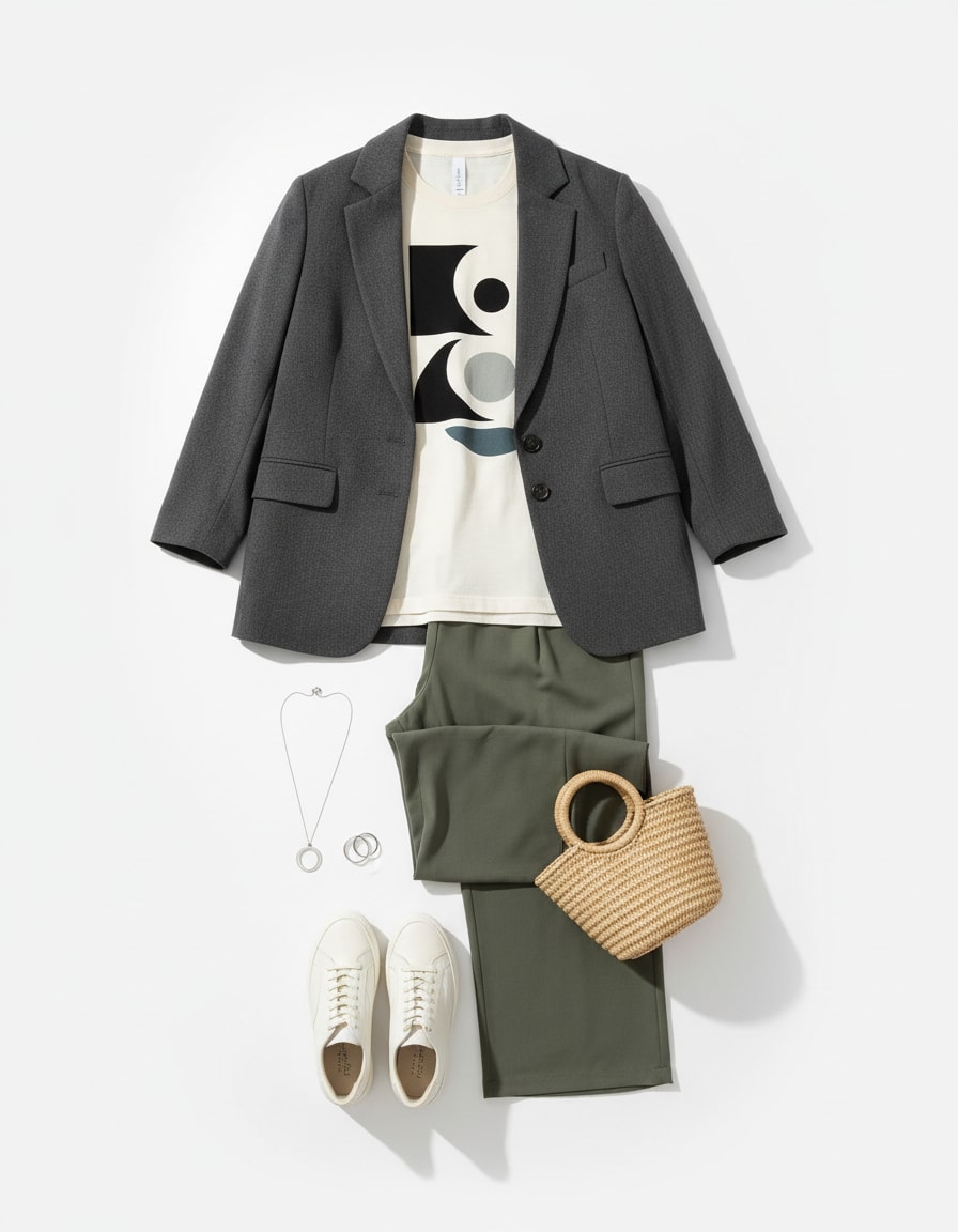 - Blazer + graphic tee + wide-leg pants — creative or casual workplace.