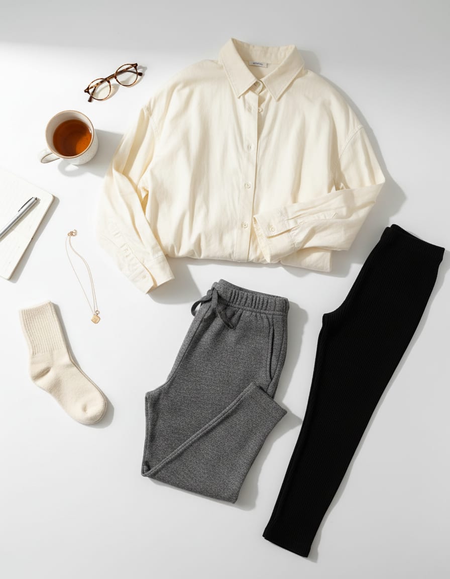 - Oversized shirt + leggings or joggers — Button-down left open or tied; comfy bottom half. Looks intentional from the waist up.