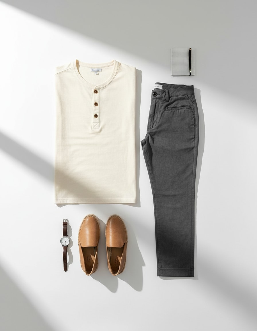 - Polo or henley + chinos — Slightly more structured than a tee; still relaxed. Works for casual-Friday vibes.