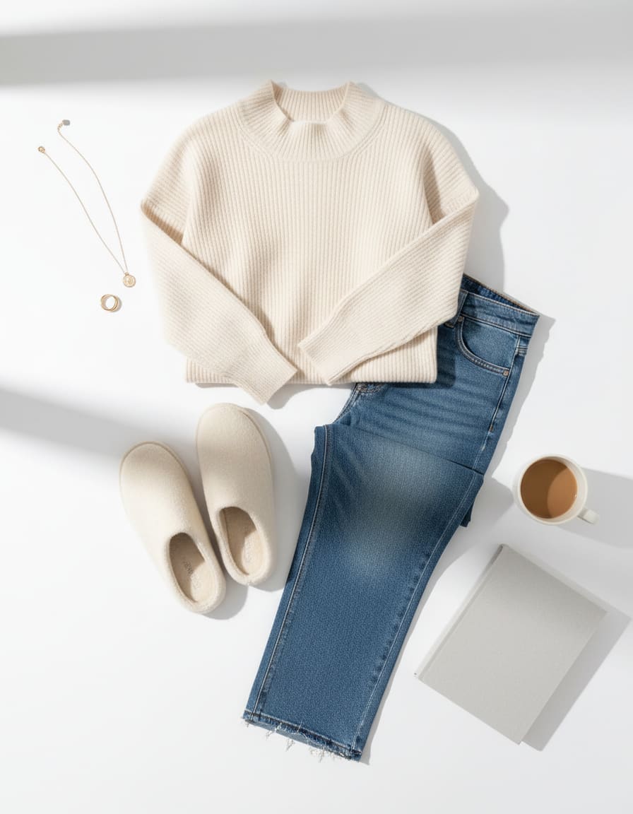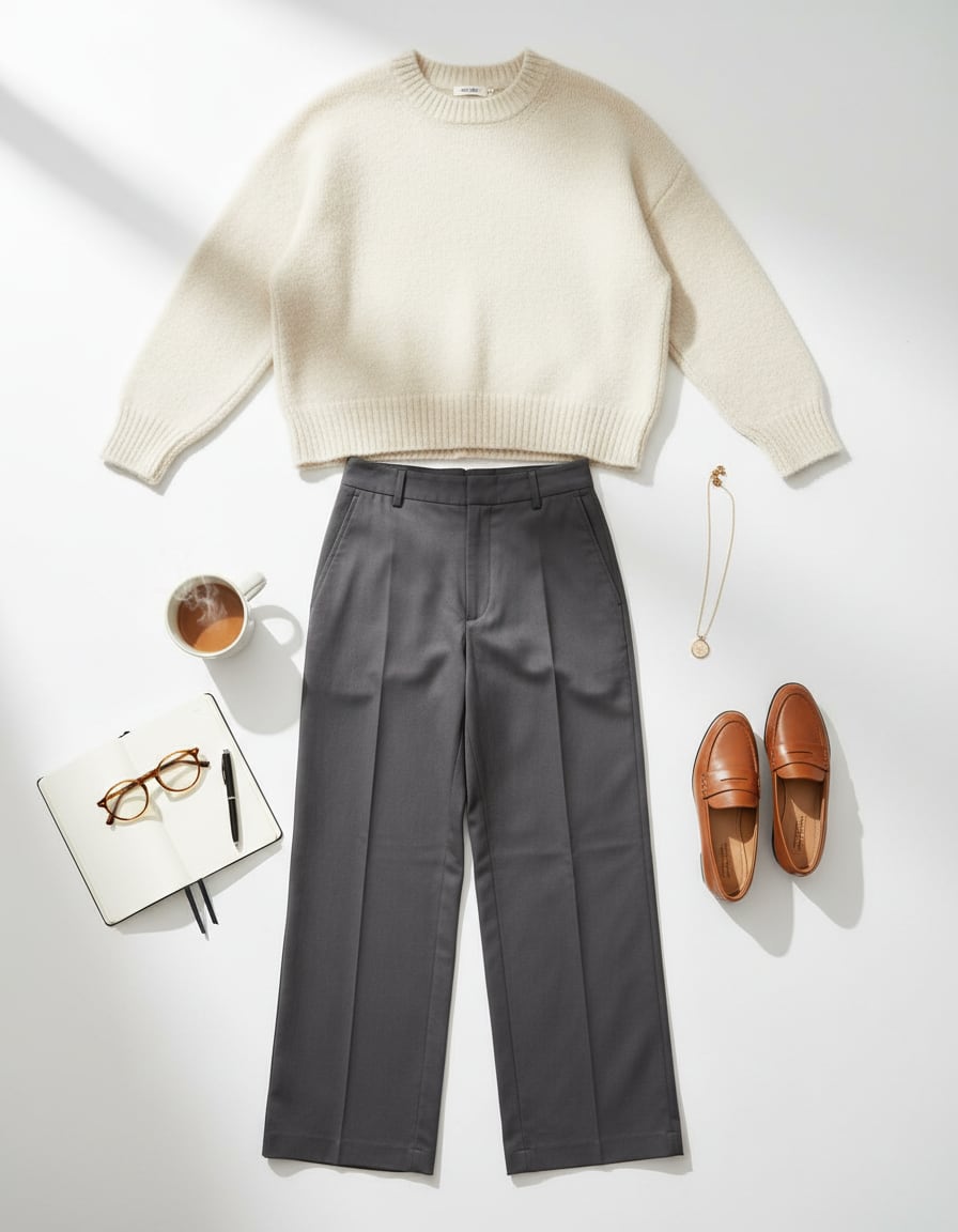 - Soft sweater + high-waisted pants — Warm and polished. Fine for all-day wear and calls.
