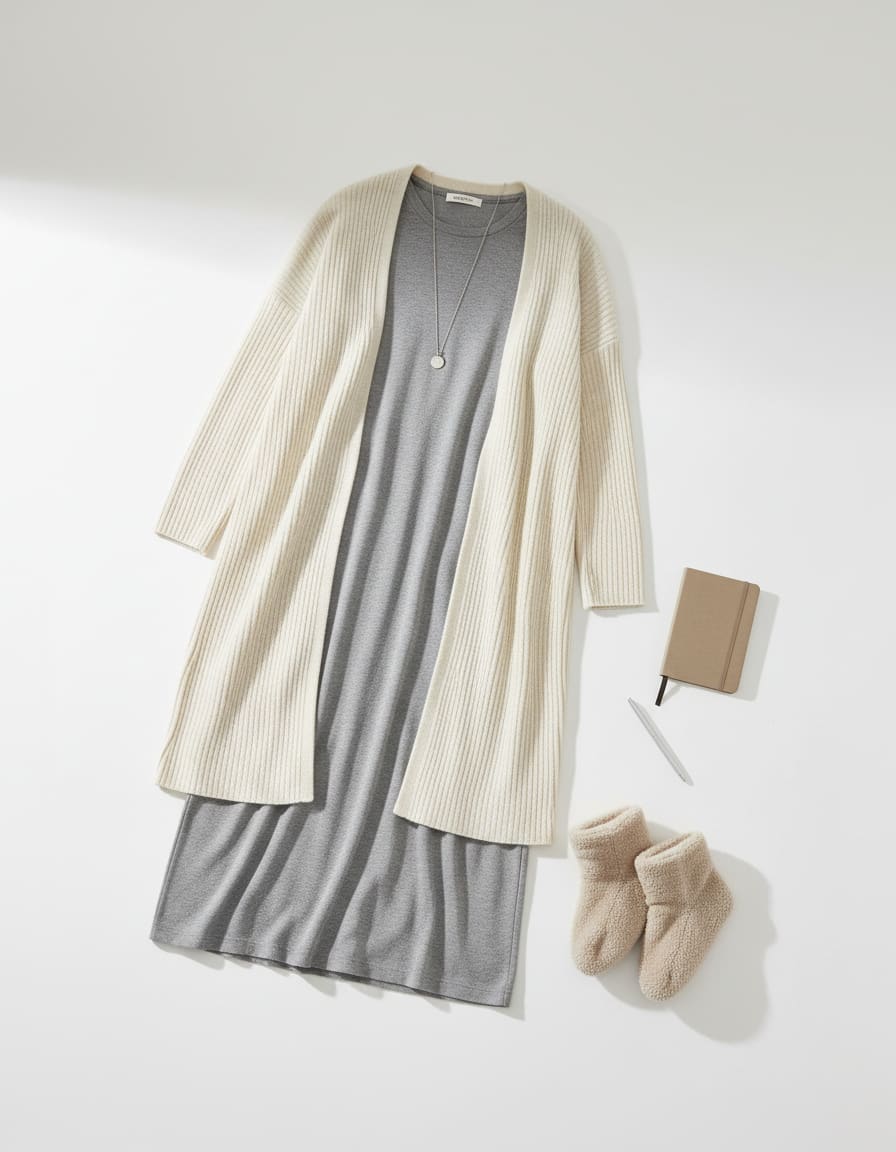 - Midi dress or tunic + cardigan — One piece, minimal thinking. Add a cardigan for warmth and a bit of polish.